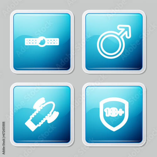 Set line Silicone ball gag, Male gender symbol, Dildo vibrator for sex games and Shield with 18 plus icon. Vector