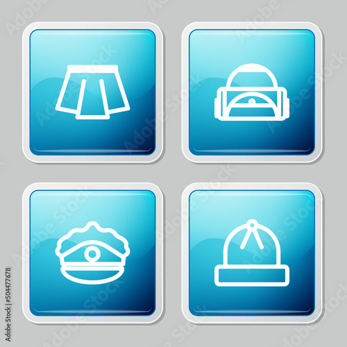 Set line Skirt, Sport bag, Police cap with cockade and Winter hat icon. Vector