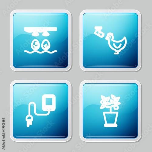 Set line Smart farm with bulb and plant, Chicken camera, Sensor and Plant in pot icon. Vector