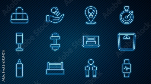 Set line Smart watch with heart, Bathroom scales, Boxing glove, Dumbbell, Punching bag, Sport, ring and icon. Vector