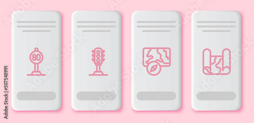 Set line Speed limit traffic, Traffic light, City map navigation and Folded. White rectangle button. Vector