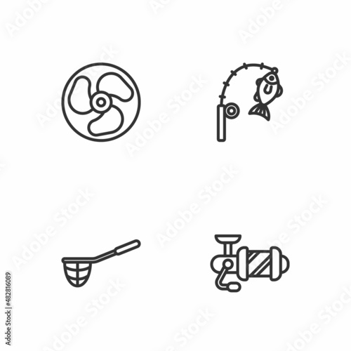 Set line Spinning reel for fishing, Fishing net, Outboard boat motor and rod and icon. Vector