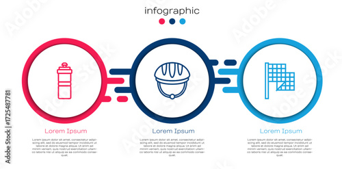 Set line Sport bottle with water, Bicycle helmet and Checkered flag. Business infographic template. Vector