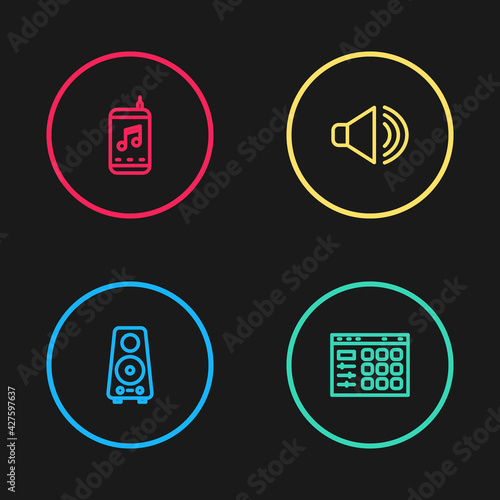Set line Stereo speaker, Drum machine, Speaker volume and Music player icon. Vector