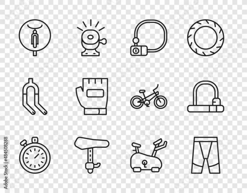 Set line Stopwatch, Cycling shorts, Bicycle lock, seat, Gloves, Stationary bicycle and icon. Vector