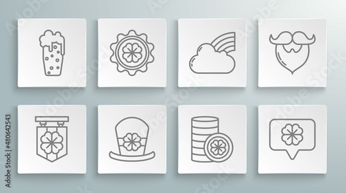 Set line Street signboard with four leaf clover, Bottle cap, Leprechaun hat and, Gold coin, Four speech bubble, Rainbow cloud, Mustache beard and Glass of beer icon. Vector