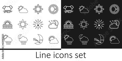 Set line Sun and cloud weather, Cloud with moon stars, Sunset, and icon. Vector