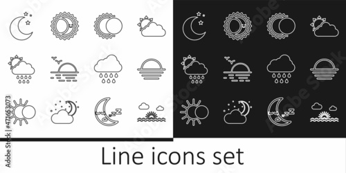 Set line Sunset, Eclipse of the sun, Cloud with rain and, Moon stars, and icon. Vector