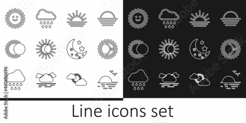 Set line Sunset, Eclipse of the sun, Moon and stars and Cloud with rain icon. Vector