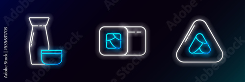 Set line Sushi, Traditional Japanese tea ceremony and icon. Glowing neon. Vector