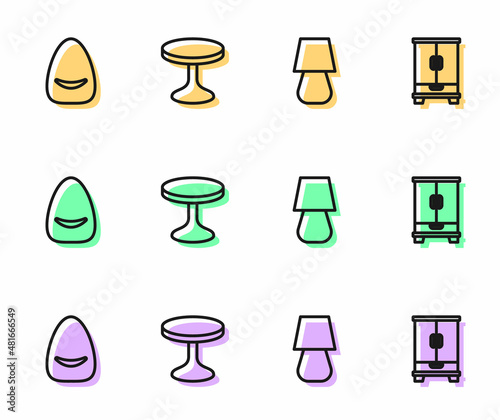 Set line Table lamp, Pouf, Round table and Wardrobe icon. Vector