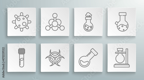 Set line Test tube and flask chemical, Bacteria, Biohazard symbol, on stand, and icon. Vector