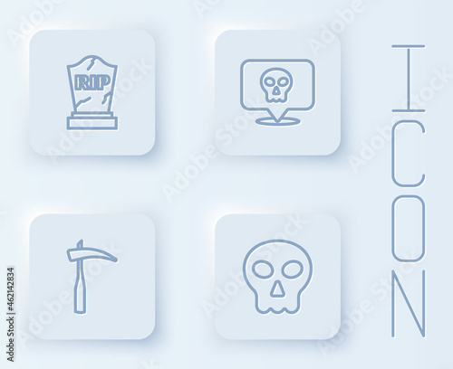 Set line Tombstone with RIP written, Skull, Scythe and . White square button. Vector