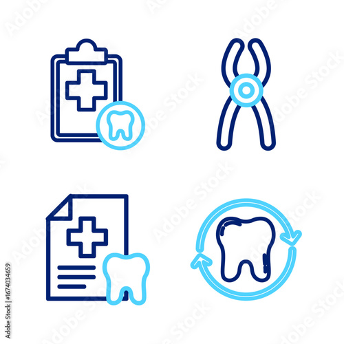 Set line Tooth whitening, Dental card, pliers and icon. Vector