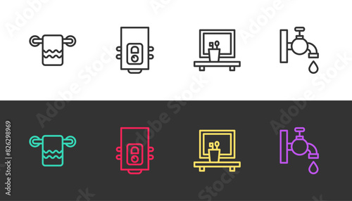 Set line Towel on a hanger, Gas boiler, Washbasin mirror and Water tap on black and white. Vector