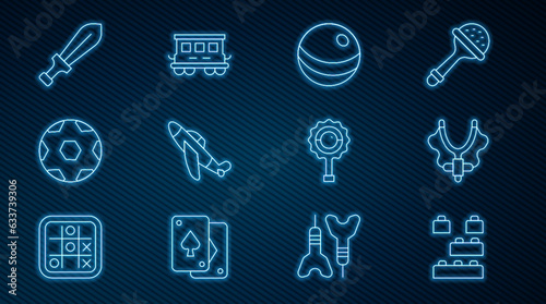 Set line Toy building block bricks, Slingshot, Beach ball, plane, Soccer football, Sword toy, Rattle baby and Passenger train cars icon. Vector