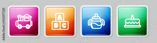 Set line Toy train, ABC blocks, Baby bottle and Cake with burning candles. Colorful square button. Vector