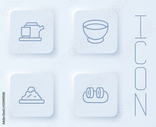Set line Traditional tea ceremony, Soy sauce in bowl, Rice and Sushi. White square button. Vector