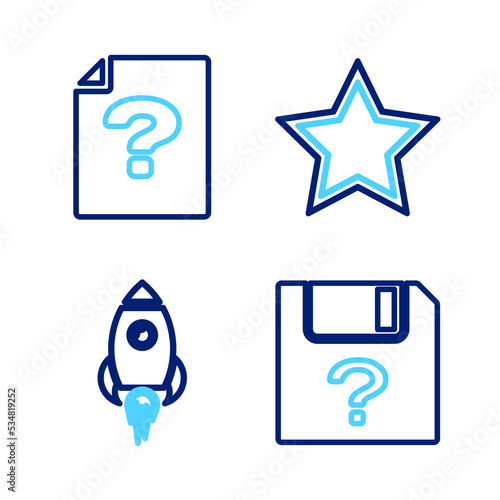 Set line Unknown document, Rocket ship with fire, Star and icon. Vector
