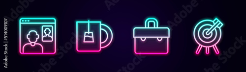 Set line Video chat conference, Cup of tea, Briefcase and Target financial goal. Glowing neon icon. Vector