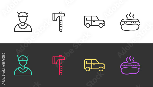 Set line Viking head, Wooden axe, Car and Hotdog sandwich on black and white. Vector