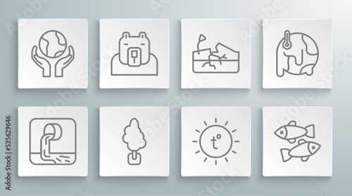 Set line Wastewater, Polar bear head, Tree, Sun, Dead fish, Earthquake, Global warming and Hands holding globe icon. Vector
