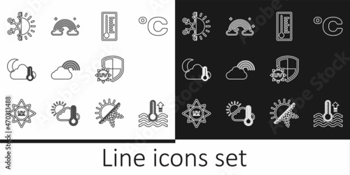 Set line Water thermometer, Rainbow with sun, Meteorology, cloud, Thermometer and cloud, moon, Sun snowflake, UV protection and clouds icon. Vector