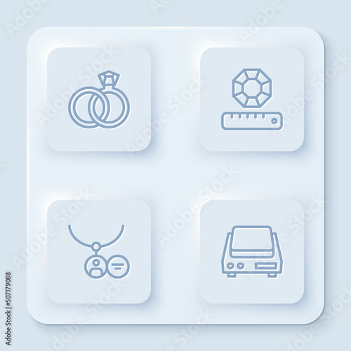 Set line Wedding rings, Gem stone, Locket necklace and Electronic jewelry scales. White square button. Vector