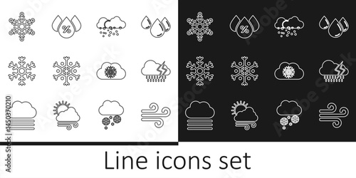 Set line Wind, Cloud with rain and lightning, snow, Snowflake, and Water drop percentage icon. Vector