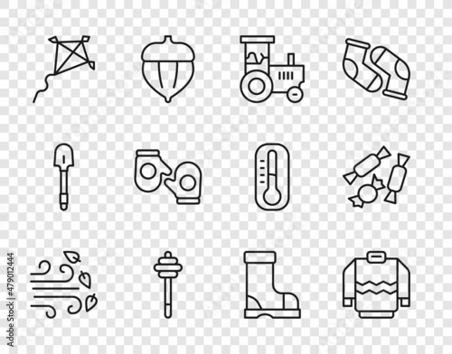 Set line Windy weather, Sweater, Tractor, Honey dipper stick, Kite, Christmas mitten, Waterproof rubber boot and Candy icon. Vector