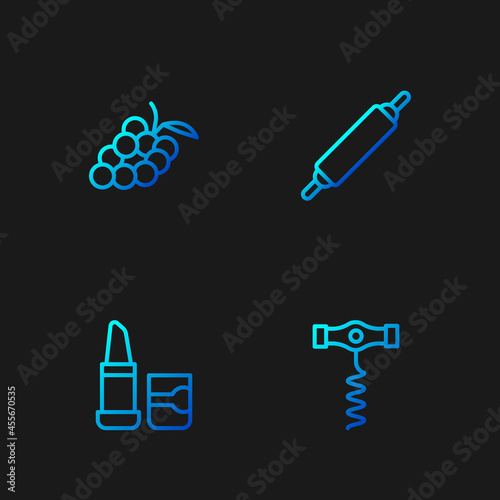 Set line Wine corkscrew, Lipstick, Grape fruit and Rolling pin. Gradient color icons. Vector