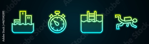 Set line Winner podium, Stopwatch, Swimming pool with ladder and Scuba diver. Glowing neon icon. Vector