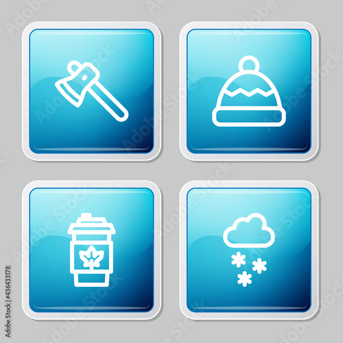 Set line Wooden axe, Beanie hat, Coffee cup to go and Cloud with snow icon. Vector