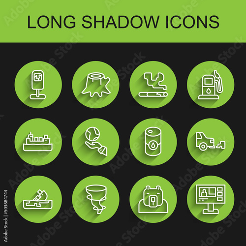 Set line Wrecked oil tanker ship, Tornado, Trash can, Polar bear head, Television report, Hands holding Earth globe, Car exhaust and Barrel icon. Vector