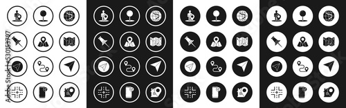 Set Location on the globe, Folded map with location marker, Push pin, Map silhouette of person, Paper airplane and icon. Vector