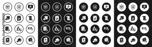 Set Location shield, Calendar with, Delivery insurance, Life, Document, House, Money and icon. Vector