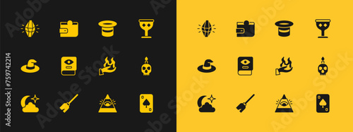 Set Medieval goblet, Witches broom, Hand holding fire, All-seeing eye of God, Ancient magic book, Magic hat, stone and Wallet icon. Vector
