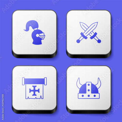 Set Medieval helmet, Crossed medieval sword, Crusade and Viking in horned icon. White square button. Vector