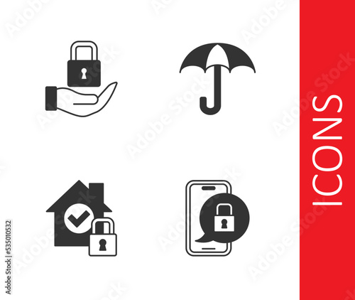 Set Mobile with closed padlock, Lock, House under protection and Umbrella icon. Vector