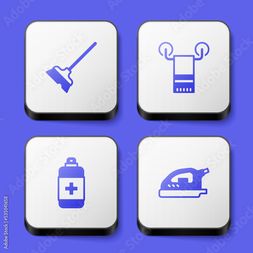 Set Mop, Towel on hanger, Antibacterial soap and Electric iron icon. White square button. Vector