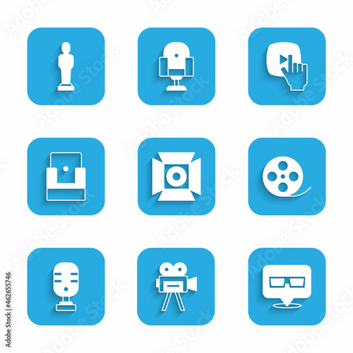 Set Movie spotlight, Retro cinema camera, 3D glasses, Film reel, Microphone, Cinema chair, Online play video and trophy icon. Vector