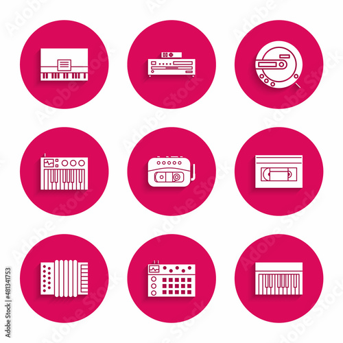Set Music tape player, Drum machine, synthesizer, VHS video cassette, Musical instrument accordion, CD and Piano icon. Vector