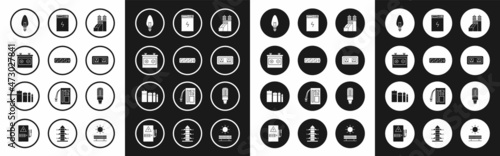 Set Nuclear power plant, Electric extension cord, Car battery, Light bulb, Electrical outlet, Power bank, LED light and Battery icon. Vector