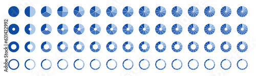 Set o blue round pie charts elements. Collection of circular pie charts 1 to 15 parts, options elements set EPS10 - Stock Vector.