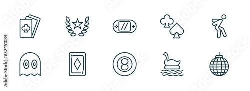 set of 10 linear icons from arcade concept. outline icons such as gambler, glory, video console, eight ball, swan boat, disco vector