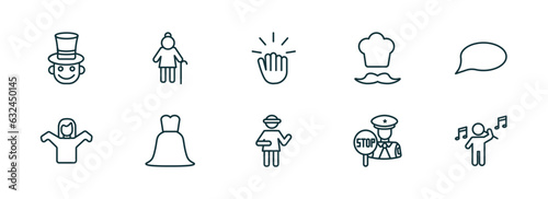 set of 10 linear icons from people concept. outline icons such as magician boy, old lady walking, knocking, napoleon figure, traffic police, man playing a flute vector