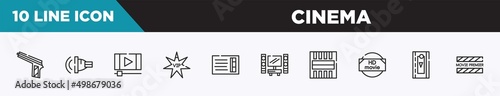 set of 10 outline cinema icons. editable thin line icons such as hitman, ventriloquist, footage, vip person, prompt box, home cinema, freeze frame vector illustration.