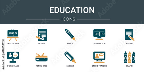 set of 10 outline web education icons such as chalkboard, grades, pencil, translation, writing, online class, pencil case vector icons for report, presentation, diagram, web design, mobile app