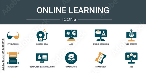 set of 10 outline web online learning icons such as eyeglasses, school bell, ask, online coaching, web camera, parchment, computer-based training vector icons for report, presentation, diagram, web