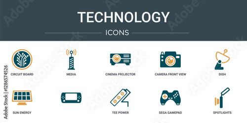 set of 10 outline web technology icons such as circuit board, media, cinema projector, camera front view, dish, sun energy, vector icons for report, presentation, diagram, web design, mobile app